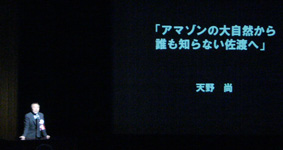 旧巻町出身で世界的カメラマンである天野尚(たかし)氏による記念講演「アマゾンの大自然から誰も知らない佐渡へ」。ロビーでは氏の写真を展示。