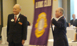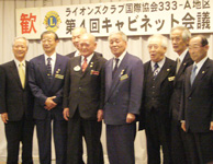 地区年次大会も無事終わり、本年度加藤ガバナー最後のキャビネット会議が開かれ、廣田地区名誉顧問と次期副幹事L.白井が参加した。 (上左) ガバナー旗が加藤ガバナーから坂井ガバナーエレクトへ渡された。(上右) 次期ガバナーの挨拶。(下) 懇親会のステージ。