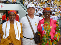 24日(火) インターナショナルパレードの集合場所で (左)本物のレオがお出迎え (中)早速国際交流を開始 (右)330は東京地区