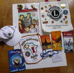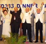 25日(水)夜に開かれた333複合地区のガバナー晩餐会 (左)坂井ガバナーエレクト(当時)と (中)現ガバナーとエレクト達が壇上に (右)交換したピンなどのお土産