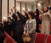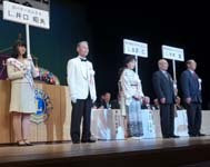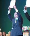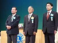 大会のハイライト、地区ガバナーエレクト L.井口昭夫(魚沼L.C)の入場。第1副地区ガバナーエレクト L.田邊仁(長岡L.C)、第2副地区ガバナーエレクト L.牛木護(新潟八千代L.C)と三役揃い踏み。ガバナーズキーの伝達で次期キャビネットが始動する。