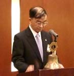 (左) 国際会長アワード20年モナークシェブロンを受けたL.水野(義)とL.白井 (中) 最後に時間をたっぷり取ってT.Tの活躍をしたL.長谷川 (右) 一年間の大役が終わり最後のゴングを打つ田村会長。ご苦労様でした