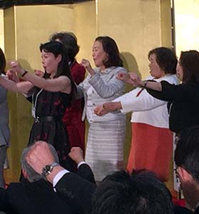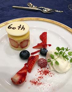 (左) アトラクションは古町芸妓の踊り (中) デザートに60周年の文字 (右) 渡部会長も登壇してローア