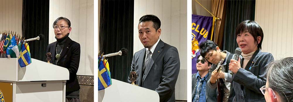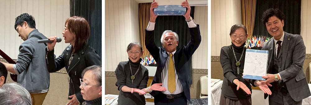 エクステンションした新潟信濃川L.C新年例会にクラブから5名で参加した。左より新潟信濃川L.C谷藤会長、齋藤第一副会長、チャーターメンバーでもあるL.森ゆうこ おなじみのL.奈良橋のパフォーマンスの後、プレゼントの抽選でL.風間が見事一等、石川幹事が三等のお肉を引き当てた。