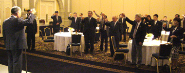 例会後の懇親会は、L.田中一郎のウィサーブから開宴。 最後は、次期村山会長と松田幹事のローア。