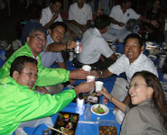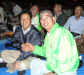 打ち上げに成功し喜び合う小千谷L.C高野会長と村山会長。宴会はいよいよ盛り上がる。