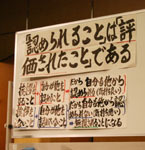 教育者として決して無理強いすることなく現場からのヒントで実践していく姿勢は、これからの若者の生き方を示してくれるものとして、人間の基本は「あいさつ」からとの意味が、手書きのボードでの説明からもとてもよく理解できた。開場は最初から最後まで熱気と笑いに包まれ、席を立ったり居眠りをする人を見かけることがなかった。