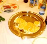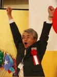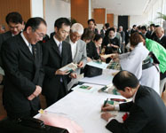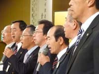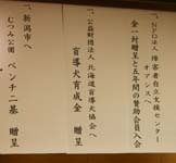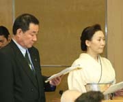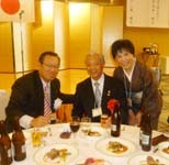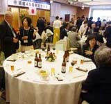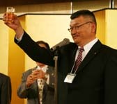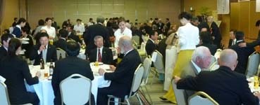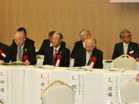 式典も無事終了し、いよいよ祝宴が開宴。 はるばる北海道よりお越しいただいた札幌オーロラライオンズクラブ見上会長を中心にウィサーブ。お馴染みの「天神囃子」で賑やかな宴が始まった。 今回参加できなかった高知東L.Cから「小夏」ミカン、札幌オーロラL.Cからは銘菓、西蒲リバティL.Cから名物の漬物の差し入れが届けられた。