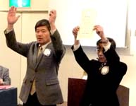 (右 )新入会員増強感謝状並びに記念品がスポンサーである田村会長とL.山田贈られた。
