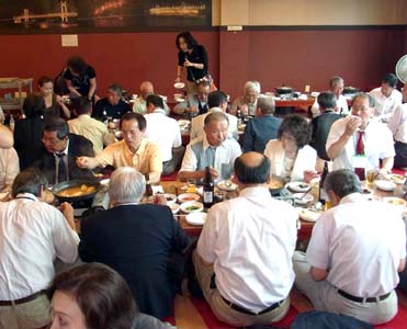(左) 会場の外で、牛木第二(現第一)副地区ガバナーと共に (右) 1Rの参加者たちとの昼食会