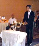 例会では、新入会員審議と、その後早速入会式が行われた。 新入会員は、佐野英世ライオン。キャンドル点火やS.P L.羽賀からラペルピンを贈られ、晴れてライオンの仲間入りをした。