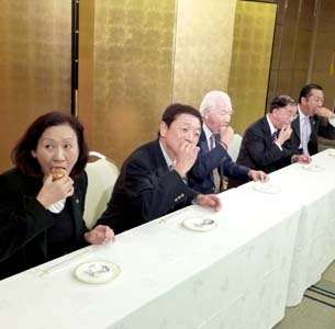 (左) 例会開催前に、7/9開催予定の「第1000回記念例会」について計画委員会が開かれた。 (中) 例会後の懇親会での楽しいゲーム(?)一斉に口に入れる食べ物に何かが入っています! (右) ゲームの餌食になった L.佐野 (でもおいしい景品がもらえました)