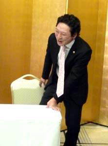 松田会長の紹介で、新潟市相撲甚句会のお二人から、主に相撲太鼓の演奏を披露していただいた。近くで生の音は、なかなか聞けない。 (左) 例会会場にふれ太鼓と共に入場 (中) 新潟市相撲甚句会・滝澤重榮会長が解説 (右) 相撲太鼓は皮が固く張ってあり、とても大きな音がする 今回は太鼓の演奏だけだったが、次は相撲甚句をお聞かせください。 (詳しい名称などが違っていた場合は、ご容赦を)