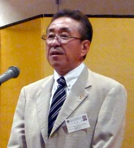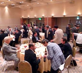 (左) ガバナー旗を受け取る牛木ガバナーエレクト (中) 会議の後は懇親会