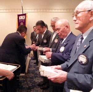(左) 前三役へ記念品を贈呈 (中) 年間100%皆出席14名のライオンに記念品贈呈 (左) L.平本よりこれまでのクラブの歴史を含めたスピーチを戴いた
