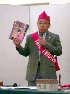 (左) 和服姿、やや緊張の面持ちでゴングを打つ水野(睦)会長 (中) ビジターとして新発田菖城、小千谷、新潟信濃川、西蒲リバティの4ライオンズクラブから三役が参加していただいた。 (左) 記念アクティビティを発表する馬場第一副会長
