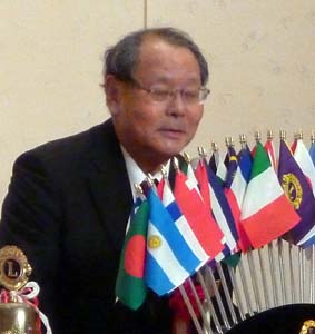 (左)水野会長、茨木幹事、熊谷会計、朝倉ZC、白井IT委員長、馬場第一副会長、L.平本、L.羽賀、L.斎藤の9名が参加 (中) 牛木ガバナーの祝辞 (右)アクティビティの垂れ幕
