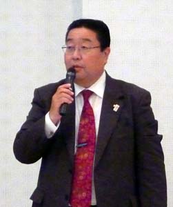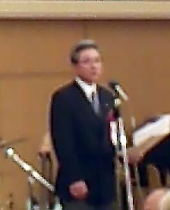 地区ガバナーズ・スローガン「誇りを持って・よく生き、よく笑い、よき奉仕に出会う」 歓迎の挨拶を述べる中澤RC、ガバナーの経歴紹介は山下キャビネット幹事、牛木ガバナーの挨拶
