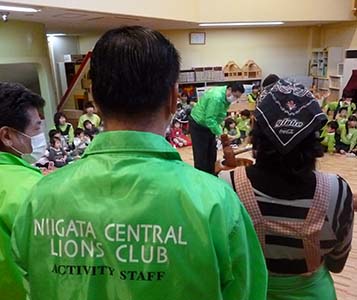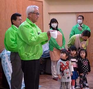 L.斎藤とL.羽賀が園児と共に杵を下ろす。お礼の楽器演奏の後、全員でつきたてを頂いた。 参加は、茨木幹事・熊谷会計・馬場第一副会長・渡部第二副会長・L.伊藤・L.羽賀・L.斎藤・L.白井・L.和田の9名