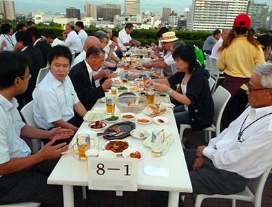 お楽しみの屋上ビアガーデンでの懇親会。左より、山口計画委員長、馬場会長の挨拶、佐藤信濃川LC会長のウィサーブ。心地よい川風に吹かれての会だった。