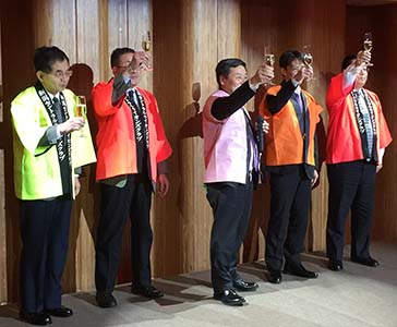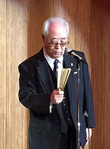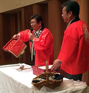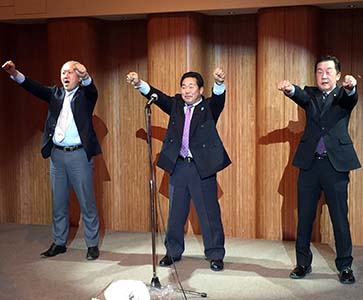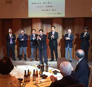 例会後の懇親会 (左) 廣田元地区がバナーが、謡「高砂」を披露 (中) 参加者の中から年男によるウィサーブ (右) お馴染み小千谷L.C一同の「天神囃子」で宴が華やかに始まった。