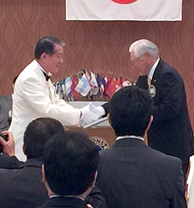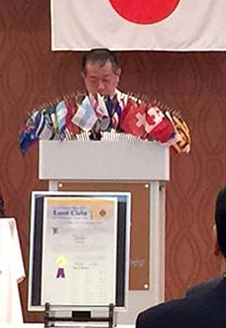(左・中) 国際協会からの認証状が新潟ロイヤルL.C初代会長 L.捧欽二に伝達された。その後、相田地区ガバナーより挨拶 (右) スポンサーとしてご尽力された坂井元ガバナーの挨拶